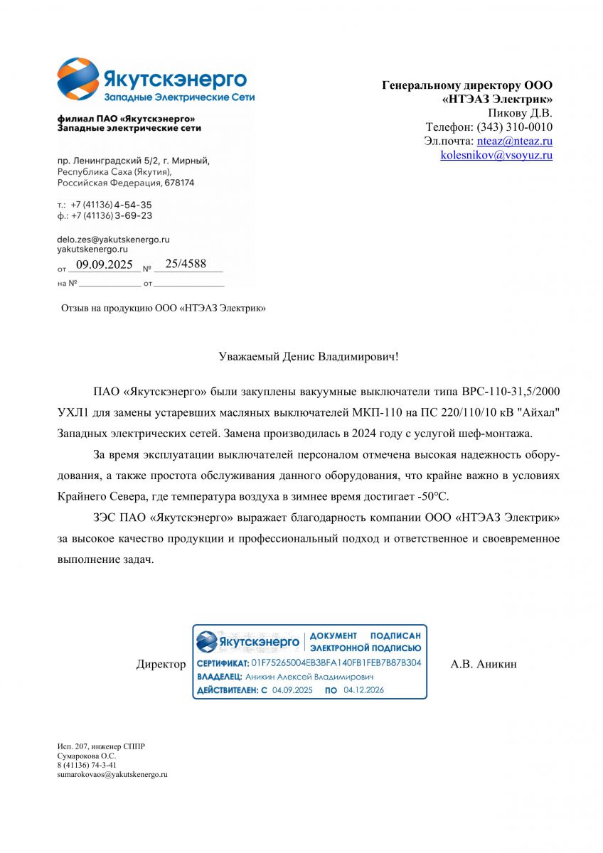 Отзыв об эксплуатации выключателя серии ВРС-110 кВ от Западных Электрических сетей ПАО «Якутскэнерго»